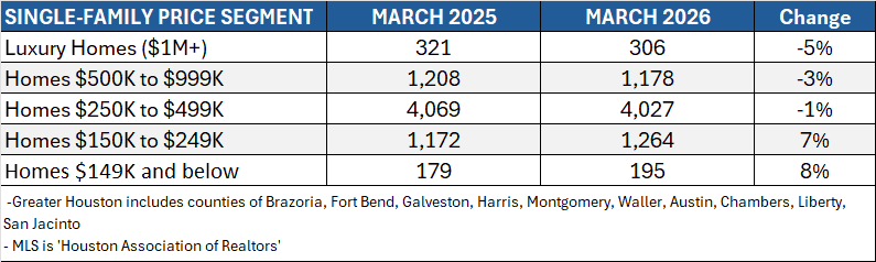 March 2026 price segment data shows a clear split between the top and bottom of the market. Luxury homes priced at $1M and above saw a 5% year-over-year decline, with 306 closings compared to 321 a year ago. The $500K to $999K segment also slid 3%, landing at 1,178 closings. Mid-range homes in the $250K to $499K range came in nearly flat, down just 1% to 4,027 closings — still the highest-volume segment in Houston by a wide margin.