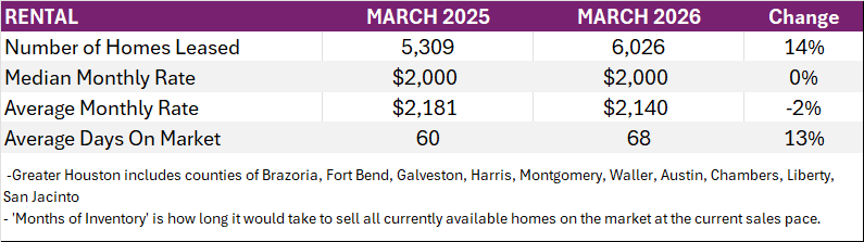 The Greater Houston rental market picked up significant volume in March 2026. 6,026 homes were leased, a 14% jump from the 5,309 leases recorded in March 2025. That is a meaningful increase in rental activity, and it reflects what many suspected: a large pool of would-be buyers is staying in the rental market longer because homeownership still feels financially out of reach for many households.