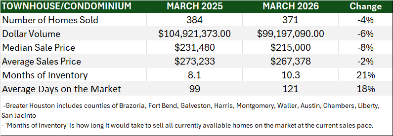 The townhouse and condominium market in Greater Houston is sending a loud signal to buyers: this is your moment. March 2026 data shows 371 closings, a 4% decline from the 384 sold in March 2025. Total dollar volume fell 6% to $99.2 million, and the median sale price dropped 8% to $215,000, down from $231,480 a year ago. The average sale price came in at $267,378, down 2% from $273,233.