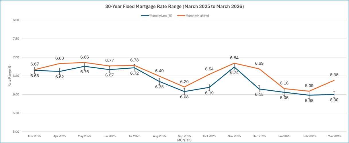 March 2026 brought the most favorable mortgage rate environment Houston buyers have seen in over a year. The 30-year fixed mortgage rate ranged from 6.00% on the low end to 6.38% on the high end during the month, with the monthly low touching a level not seen since February 2026's floor of 5.98%. To put that in perspective, rates one year ago in March 2025 ranged from 6.65% to 6.67% — roughly two-thirds of a percentage point higher.