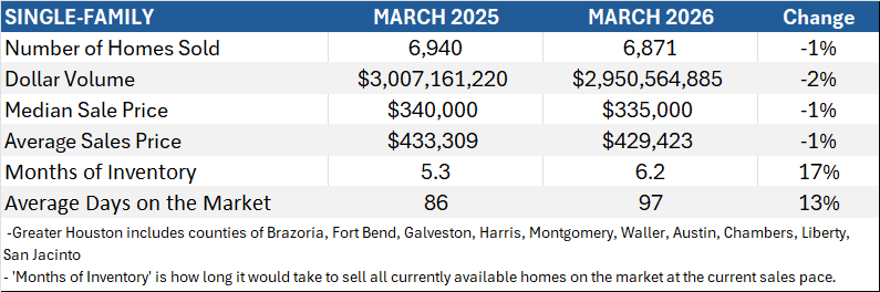 Greater Houston recorded 6,871 single-family home sales in March 2026, a 1% decline from the 6,940 sold in March 2025. On the surface, that looks almost flat. But the details below that headline number tell a much more interesting story. Total dollar volume came in at $2.95 billion, down 2% year-over-year, reflecting a combination of slightly lower prices and slightly fewer closings.